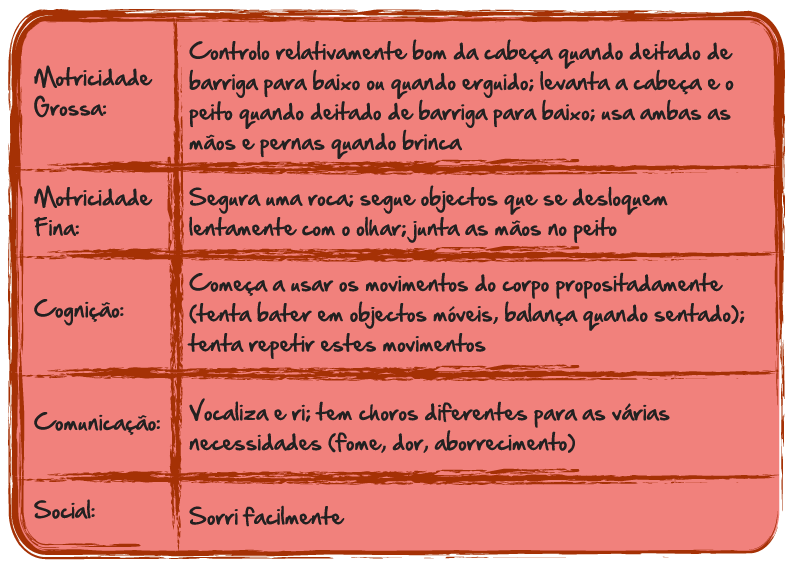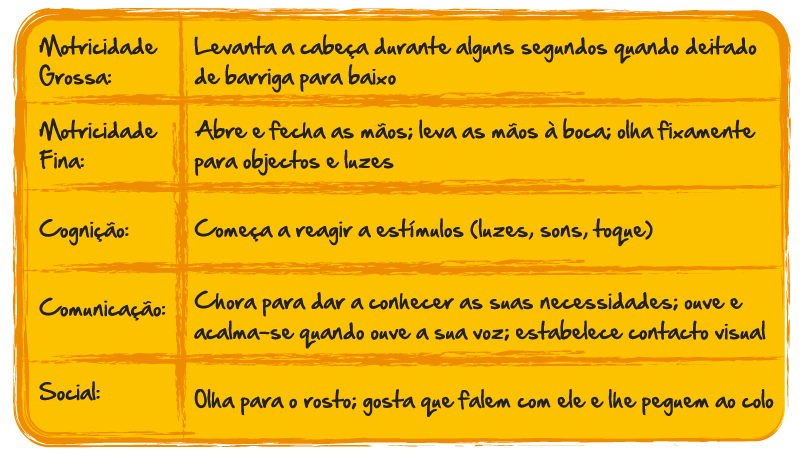 As páginas seguintes mostram de que forma os bebés prematuros habitualmente se desenvolvem, de acordo com a idade corrigida (idade ajustada). Utilize-as como guia geral para seguir os progressos do seu filho. Algumas crianças podem saltar algumas etapas, o que pode ou não afectar posteriormente a sua capacidade de aprendizagem. É importante entrar em contacto com o seu médico de família, pediatra ou especialista em desenvolvimento infantil caso observe áreas em que o seu filho esteja menos desenvolvido.